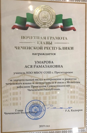 Учитель МБОУ "СОШ с.Пролетарское" Умарова Ася Рамазановна награждена Почетной грамотой Главы Чеченской Республики, а также выдали билет и значок о вступлении в Союз писателей России.