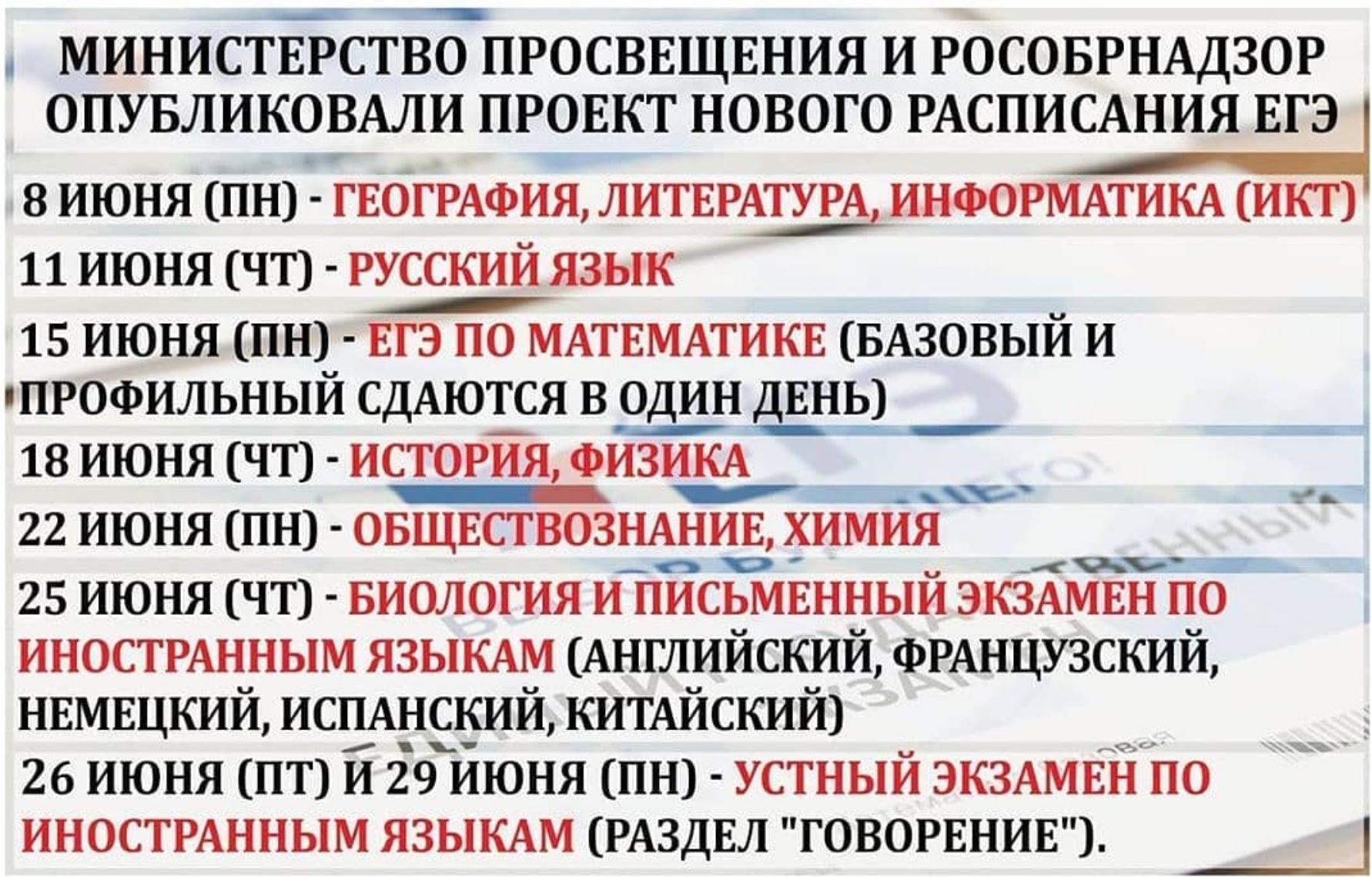 Министерство просвещения и Рособрнадзор опубликовали проект нового расписания Единого государственного экзамена (ЕГЭ) по всем предметам. Документ опубликован на портале проектов нормативных актов в понедельник, 6 апреля.Согласно новому расписанию, первый экзамен у российских одиннадцатиклассников в основной период сдачи пройдет 8 июня. В этот день они напишут ЕГЭ по географии, литературе и информатике. 11 июня состоится обязательный экзамен по русскому языку, 15 июня — по математике (и базовый, и профильный уровень).На 18 июня назначены экзамены по истории и физике, на 22-е — по обществознанию и химии, на 25-е — по иностранным языкам и биологии. Последний экзамен в основной период состоится 29 июня. В этот день выпускники будут сдавать раздел «Говорение», который является частью экзамена по иностранным языкам.Последний резервный день для сдачи ЕГЭ пока запланирован на 11 июля.
