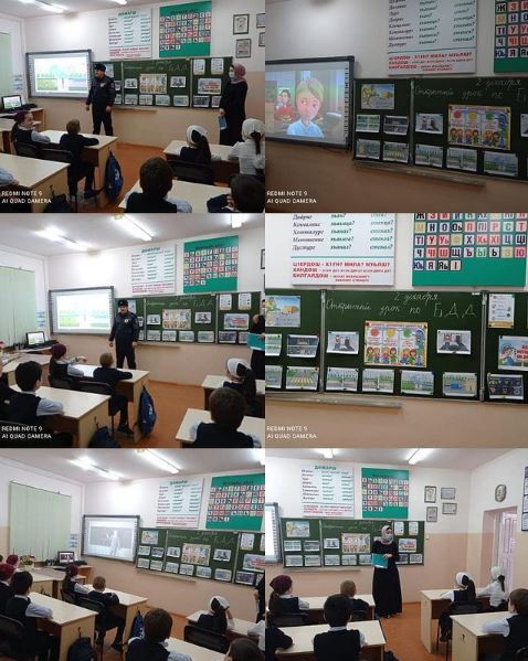 для учащихся начальной школы проведён открытый урок по безопасности дорожного движения. Был продемонстрирован мультипликационный ролик по Правилам дорожного движения, затем прошло обсуждение. По закреплению полученных знаний с обучающимися провёл беседу Самбулатов Хасан Хамитович, инспектор ДПС ОГИБДД по Грознескому району.