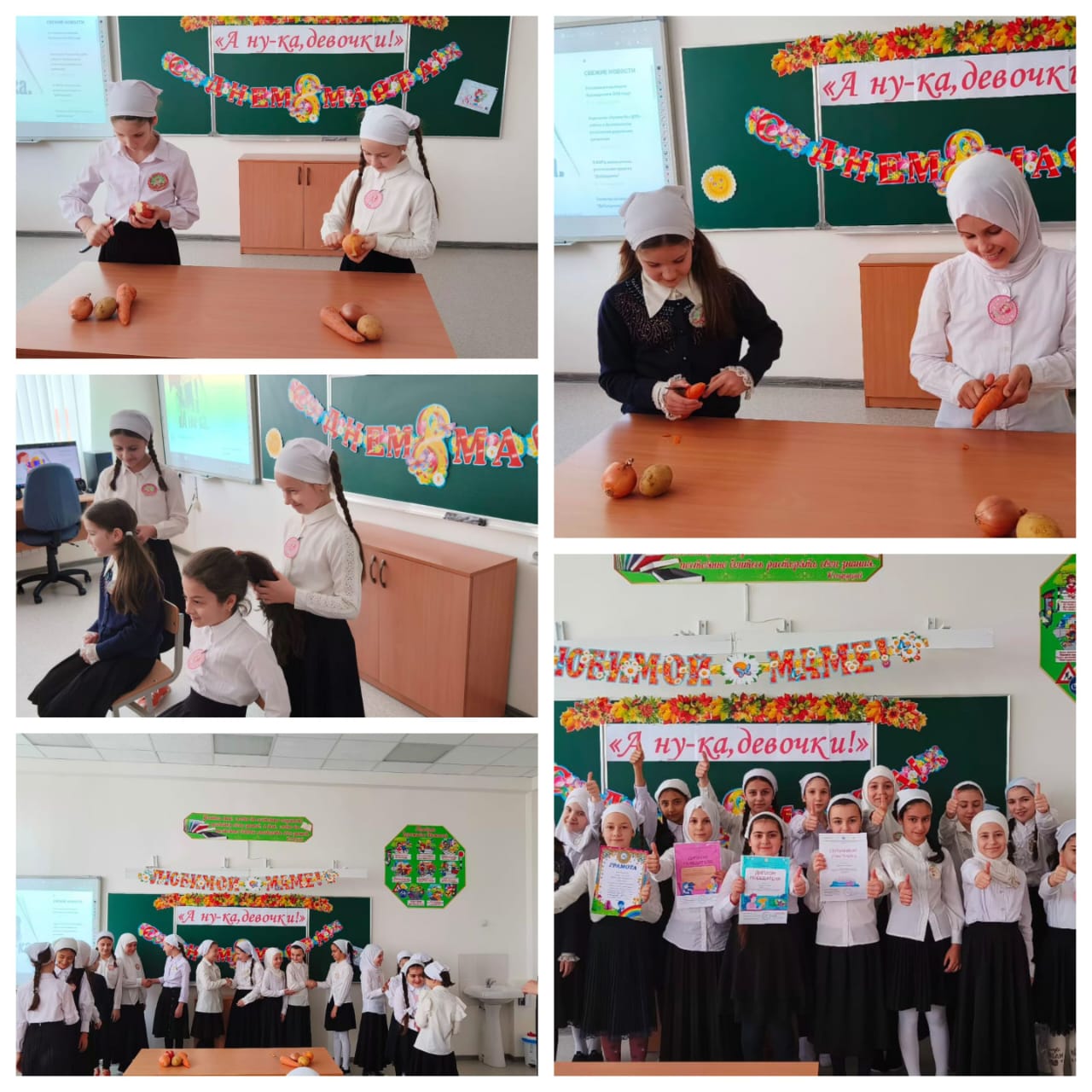 Конкурс "А ну-ка, девочки", провели среди учашихся начального звена. Девочки соревновались в роли "хозяюшек на кухне", в роли "пирикмахера" и т.д. Также, участницы приняли участие в конкурсе "Шутки-Загадки".