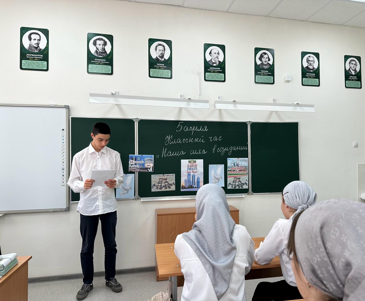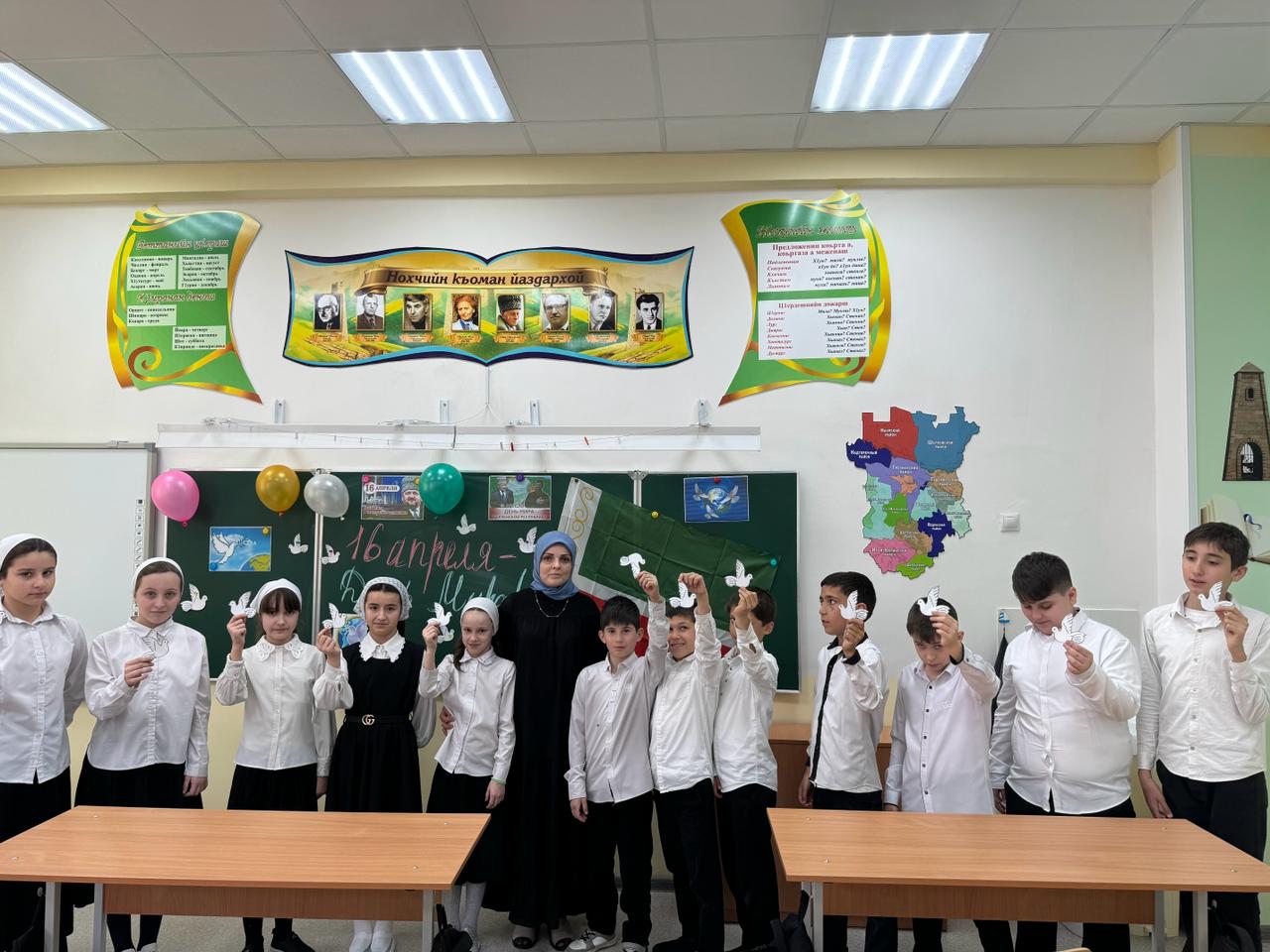 16 апреля отмечается в нашей республике как День Мира. Этот праздник был установлен Главой Республики Р.А.Кадыровым в честь даты официального объявления о завершении контртеррористической операции, которая проводилась в Чечне почти десять лет. В ознамеовании этой даты в нашей школе проведены различные мероприятия. Для учащихся 1-11 классов прошли классные часы и беседы на темы "16 апреля-День Мира", "Миру-мир", "Наша сила в созидании".