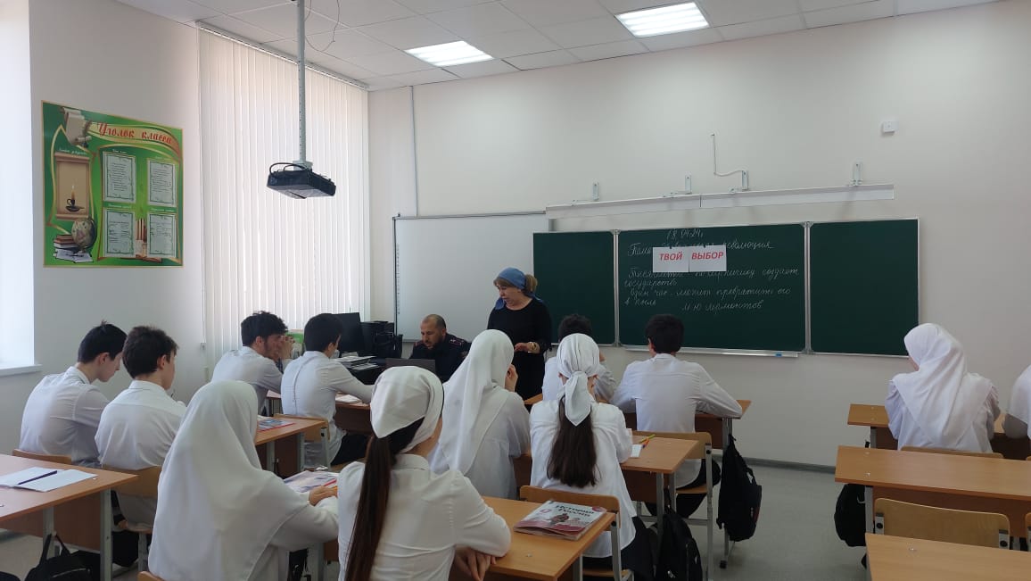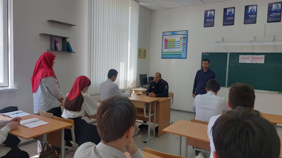 В рамках оперативно- профилактических мероприятий "Твой выбор", в целях предупреждения групповой преступности несовершеннолетних, предотвращения вовлечения их в деструктивную деятельность и проникновения в подростковую среду экстремистской идеологии, 18 апреля инспектором ОПДН ОМВД России по Грозненскому району Гиназовым А.И., совместно с заместителем директора по ВР и педагогом по ДНВ Газиевым Р.К., проведены профилактические беседы среди учащихся 9-11-х классов.